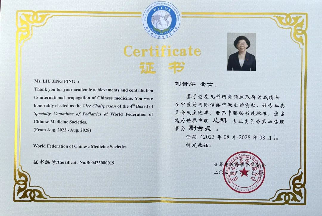918博天堂药业集团党委书记、董事长刘景萍当选世界中医药学会联合会儿科专业委员会第四届理事会副会长